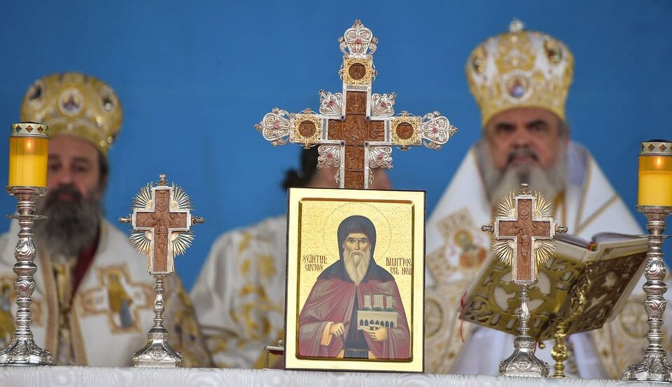 Ferecătură din argint filigran pentru cruce de binecuvântare din lemn sculptat, cu postament. Lucrată manual. Dimensiuni H 65 / l 37 cm.