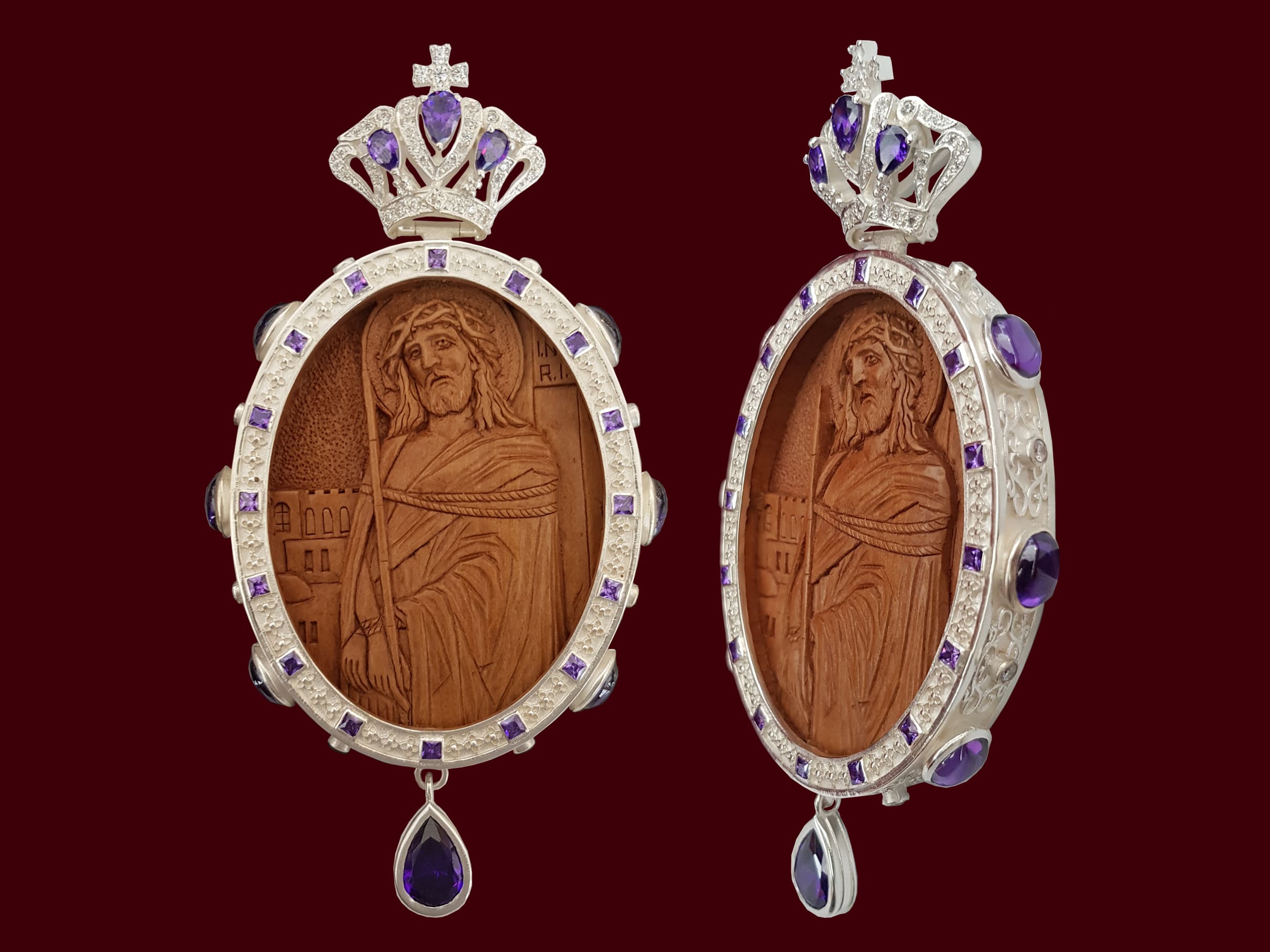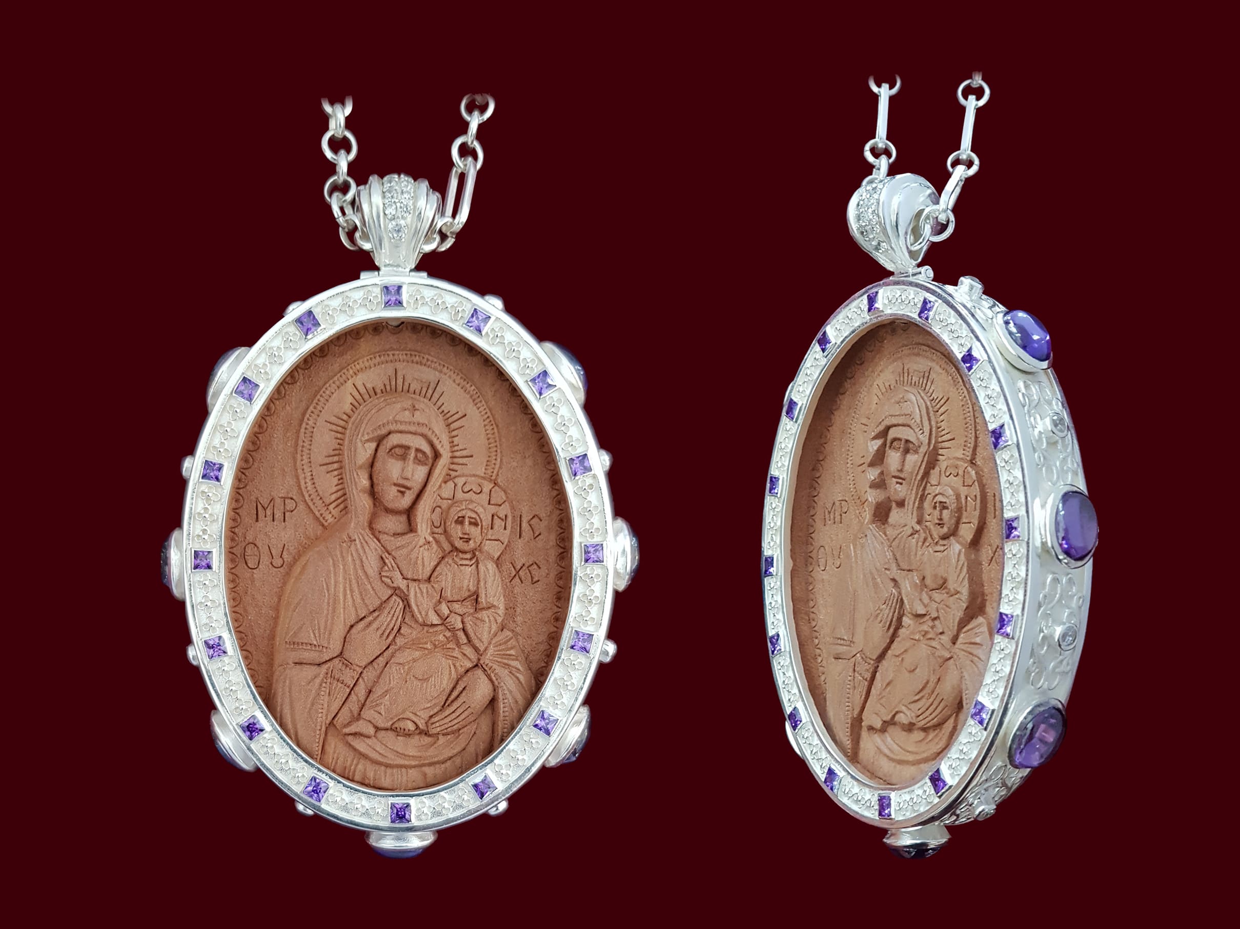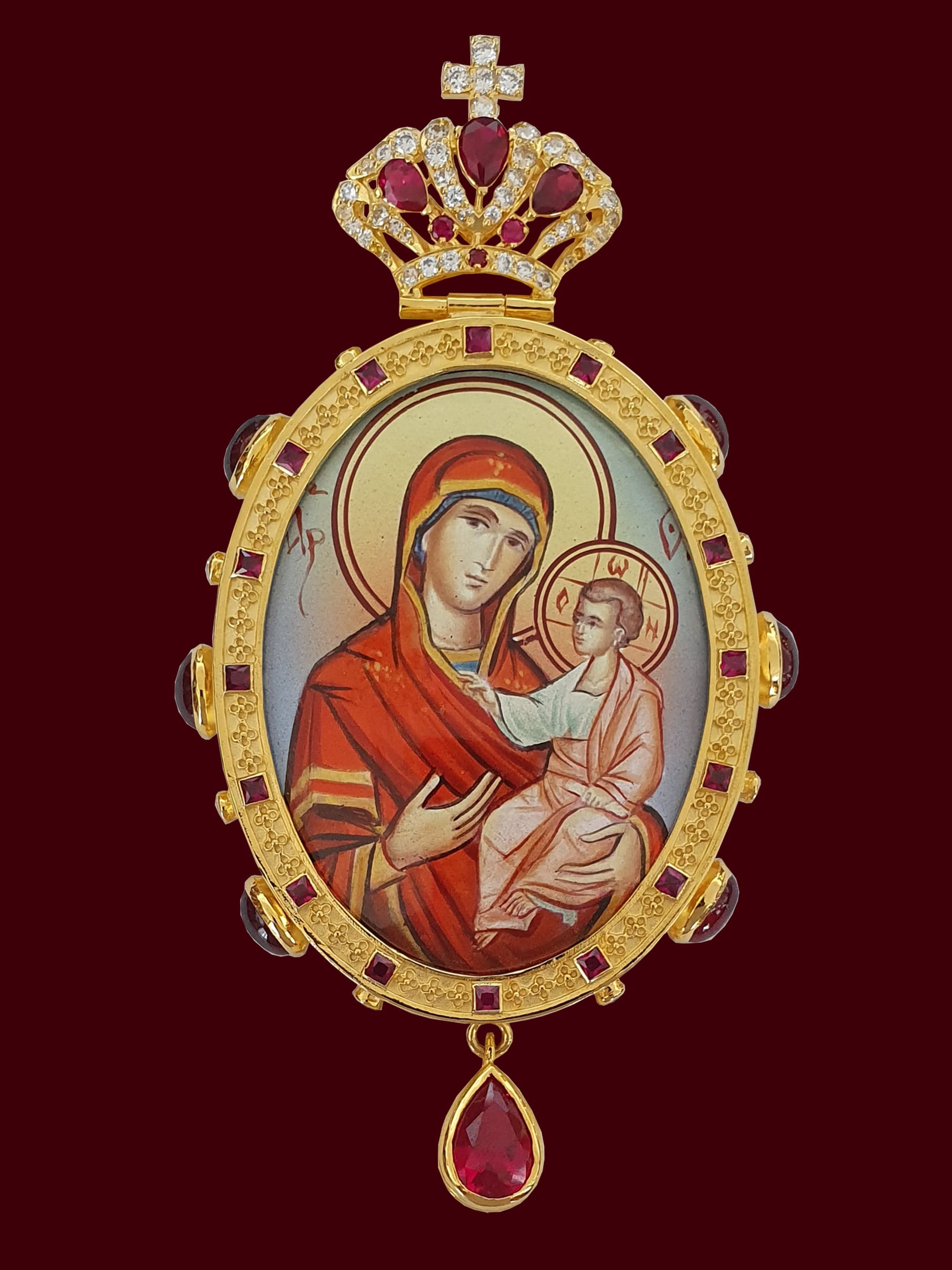 Engolpion confecționat din argint, cu pietre Zirconia țintuite manual, aurit, cu icoană email / lemn. Dimensiuni 14,5 / 7,5 cm.