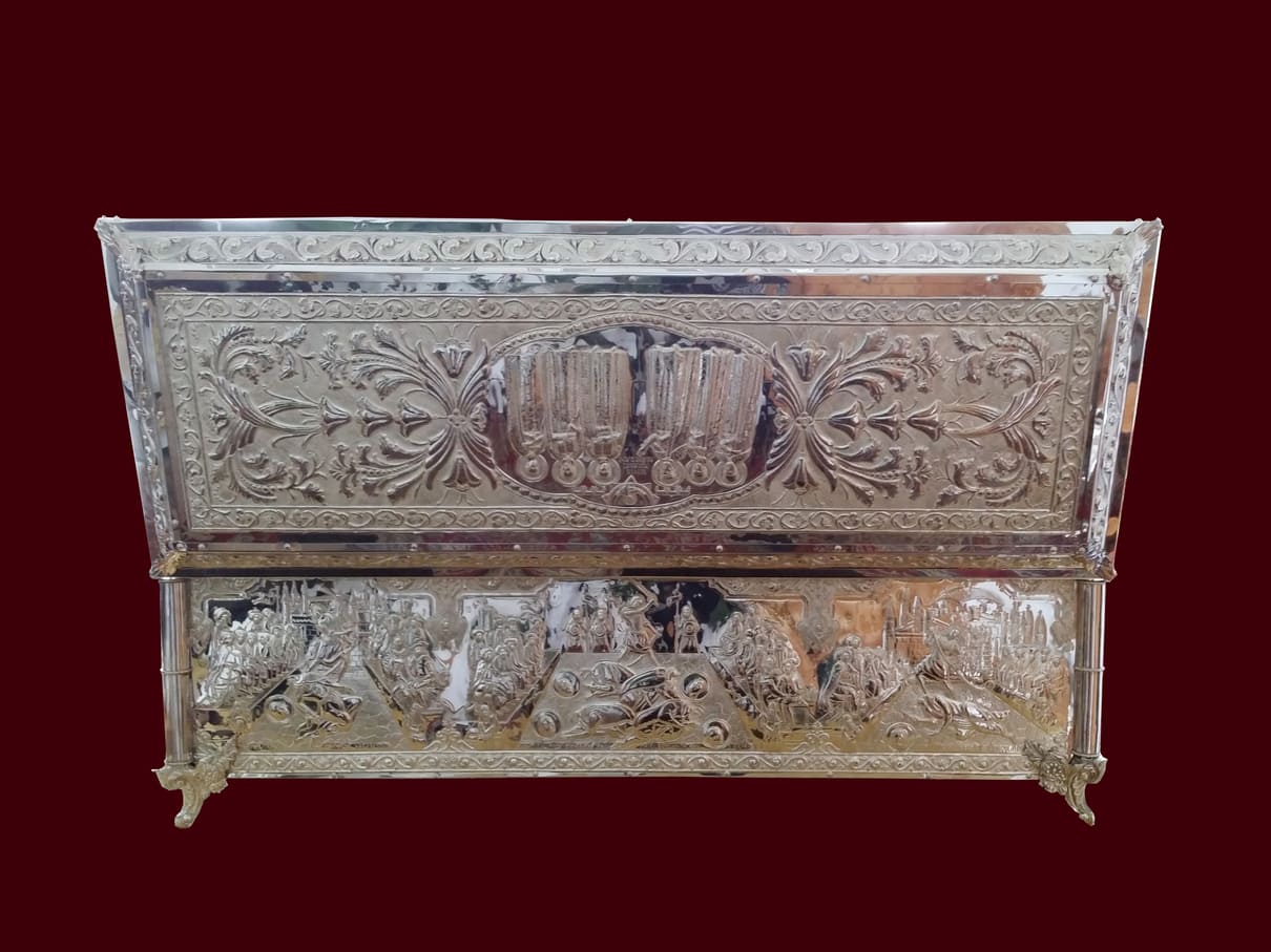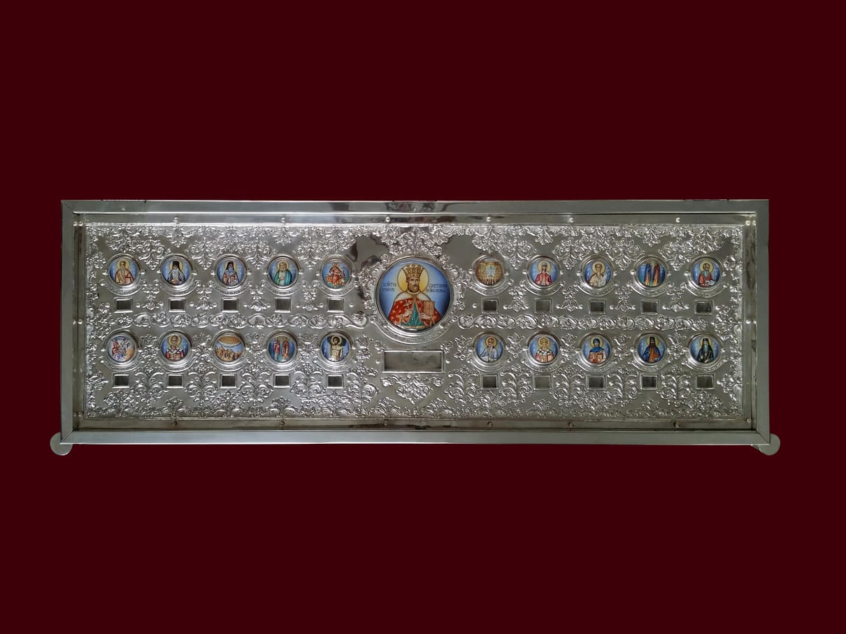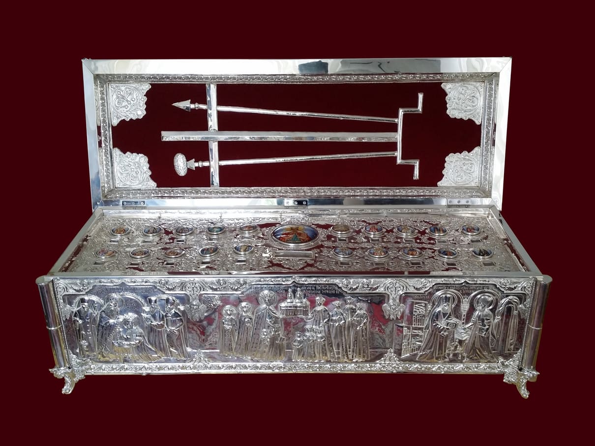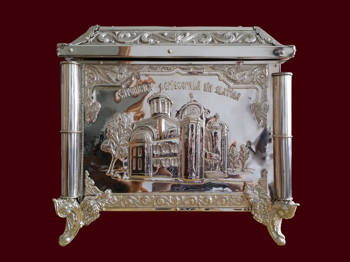 Raclă pentru sfinte moaște, confecționată din argint, cizelată manual, cu icoane email. Dimensiuni L 120 / l 40/ H 30 cm. Catedrala Episcopală din Slatina.