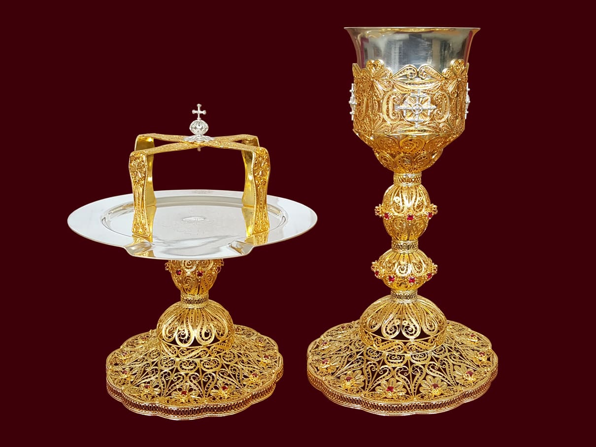 Set de Sfinte Vase confecționat din argint filigranat, aurit, cu pietre semiprețioase. Capacitatea cupei 400 ml.