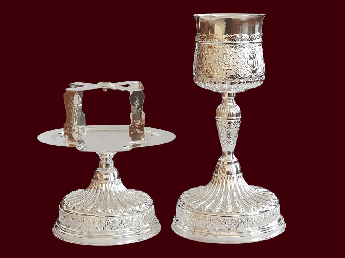 Set de Sfinte Vase confecționat din alamă și cupa din argint, cizelat manual, aurit / nichelat. La comandă se poate confecționa din argint. Capacitatea cupei 1l, talerul ø 23,5 cm.